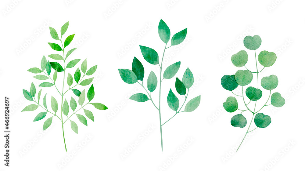 Watercolor Isolated Botanical Set Of Trendy Greenery Eucalyptus Nagi Salal Lemon Leaves Hand Drawn Cliparts Of Green Branches On White Background For Prints Textile Wedding Logo Stock Illustration Adobe Stock